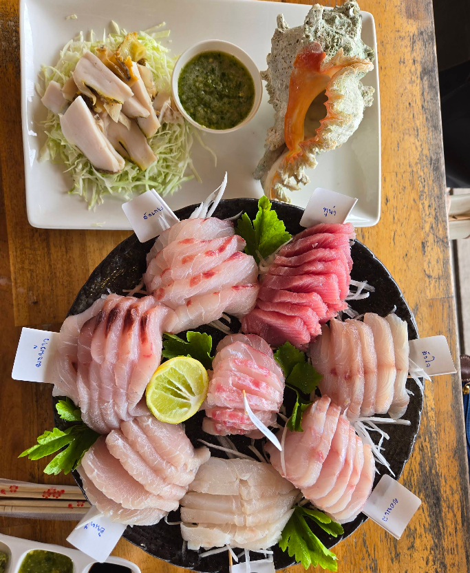 白身魚の刺身、醤油やタイ風ソースでいたきます