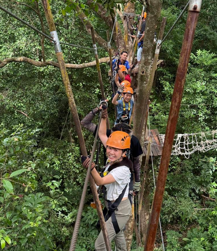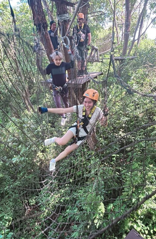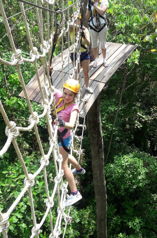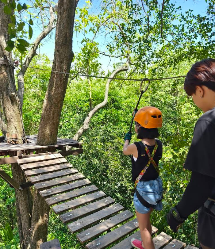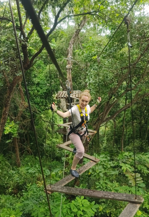 熱帯雨林に囲まれた環境の中、木々の間に張り巡らされたコースを進みながら、ジップラインやロープ橋などのアクティビティを体験できます。